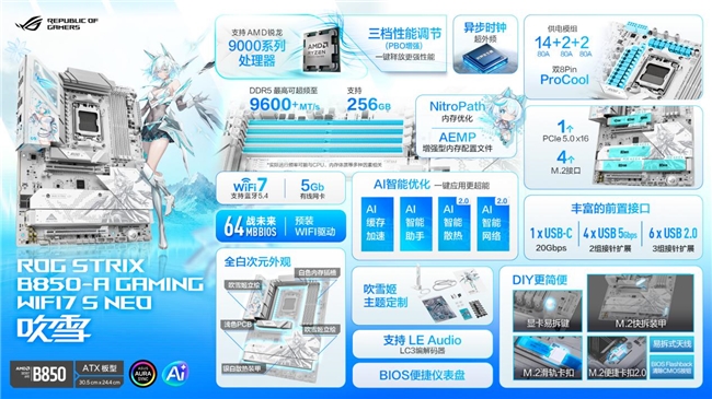 华硕ROG B850吹雪S NEO主板拥有14+2+2供电模组(80A),能充分释放锐龙9000系处理器潜力。同样加入异步时钟,可实现CPU超外频,大幅提升超频灵活性。同样拥有AI缓存加速,一键开启后可显著提升AI性能,赋能本地化AI应用高效运行。内存方面同样加入NitroPath内存优化,搭配AEMP,内存频率至高可达DDR5-9600+(OC)。板载的4个M.2接口均配备高效散热片,可有效降低温度。除了主PCIe 5.0 M.2接口配备M.2快拆装甲外,M.2_3与M.2_4的散热片也支持快拆设计,搭配M.2便捷卡扣2.0及滑轨卡扣,可免工具装卸SSD。同时板载1个前置USB 20Gbps Type-C接口、4个前置USB 5Gbps接口以及6个前置USB 2.0接口,可同时外接多个设备。网络方面同样升级至5Gb有线网口,并支持WiFi7。搭配吹雪姬主题银白易拆天线,即插即用,好看更好用。同样配备64MB大容量BIOS并预装WIFI驱动,为“战未来”做好了准备。。还有显卡易拆键,一键即可拆卸显卡,让硬件升级与维护变得前所未有的简单。音效部分同样引入新一代LE Audio技术,降低延迟,让游戏沉浸感全面提升。