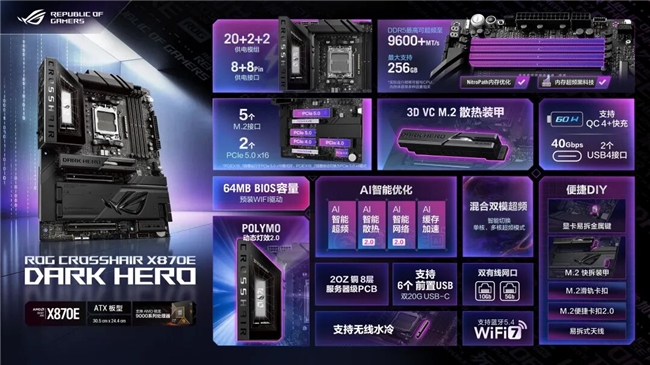 ROG CROSSHAIR X870E DARK HERO主板采用经典黑配色,诠释低调而富有质感的奢华风格。搭载Polymo动态灯效2.0并支持神光同步,轻松打造个性化灯效。该主板单品京东商城售价4899元,购买链接:https://item.jd.com/100318614000.html ;华硕商城售价4999元,购买链接:https://www.asus.com.cn/store/goods/detail?productId=42269745026303