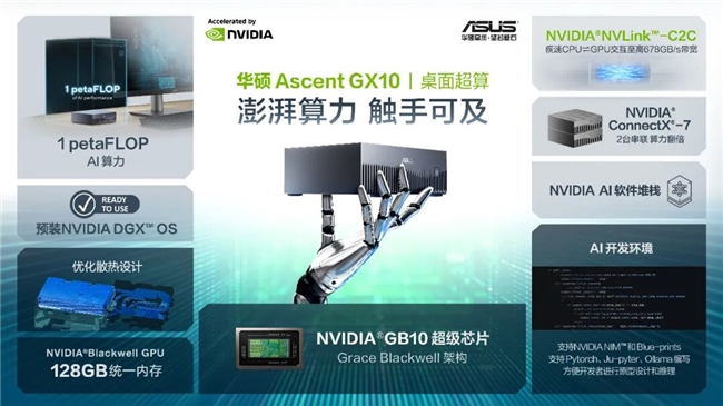 华硕Ascent GX10的登场,彻底改写了高性能计算设备的空间规则!这款仅有150×150×51mm的迷你主机,体积不足传统工作站的十分之一,却能提供每秒1千兆次浮点的AI计算性能。其核心的NVIDIA GB10超级芯片融合了Blackwell GPU与20核Arm架构Grace CPU,通过128GB LPDDR5X统一内存,为大型AI模型训练和推理提供了充沛的内存空间。