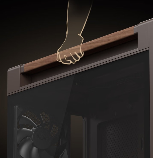 为PC DIY玩家提供全新使用体验,机箱前格栅和两侧提手,均采用定制高品质胡桃木材质,并符合FSC认证,手感非常扎实,质量值得信赖。两侧一体式胡桃木提手,可以承受30KG的重量,便于玩家调整配置和移动机箱。