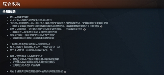 本次更新最大变动是移除了陪伴玩家671天的命石系统,并调整英雄先天技能。部分命石效果经调整后,成为先天技能、阿哈利姆魔晶效果、神装效果或天赋效果,还有一些暂时退出游戏。先天技能不再随其他技能等级提升,要么提供固定加成,要么随英雄等级提升。同时,“荆棘丛生”的劣势路得到调整,劣势路小兵离基地时略微减速,优势路小兵略微加速,改变了小兵交汇点。