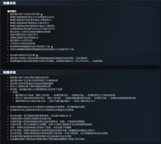 改变了痛苦魔方和肉山产生地点,痛苦魔方起始于下路裂口,肉山起始于靠近上路的巢穴。痛苦魔方拥有25%状态抗性,不再对中立单位造成伤害,产生地点更靠近莲花池且处于低地而不在高坡上了。莲花池移至更靠近劣势路防御塔,双生之门远离通往地图边境的台阶,优势路一塔和痛苦魔方间的观察者位置改变。此外,部分中立生物营地位置和等级有变,单位与技能属性也做了调整。