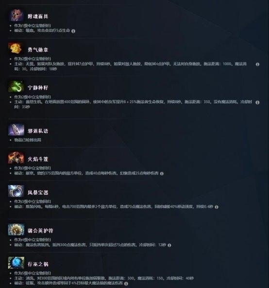 中立物品方面,“老朋友”行家阵列回归,第1级中立装可打造时间变为0:00,狂石打造要求数量增加至6块。还加入了8件全新中立宝物,如第1级采菌套具,可在树林“开采菌芝”获属性加成或金钱。瑞斯图尔尖匕等部分中立宝物回归,邪道私语暂时退出。中立物品附魔获取机制调整,第2 - 5级可选附魔数量从4增加至5,可选附魔由英雄主属性决定,部分附魔所有英雄可选。