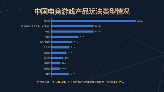 中国电子竞技游戏主要产品的玩法类型中,射击类产品占比最高,为28.3%。多人在线战术竞技类(MOBA)和体育类次之,占比均为14.1%。