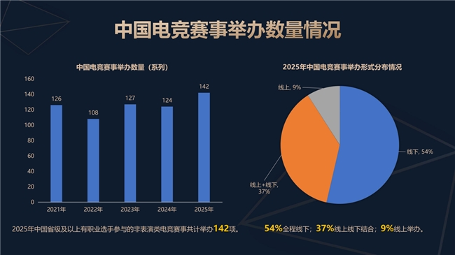 2025年,中国省级及以上有职业选手参与的非表演类电竞赛事共计举办142项,较去年增加了18项。其中,54%的赛事采用全程线下模式,37%的赛事采用线上线下结合模式,9%的赛事为纯线上模式。