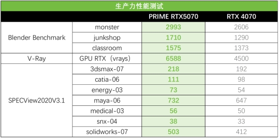在3D设计工具软件测试中,PRIME RTX5070平均领先RTX 4070大约21%,领先幅度最高的项目是V-Ray GPU RTX渲染,达到了46%,可见RTX 5070新一代RT Core在效率方面更有优势,在其他项目中也基本保持了15%左右的领先优势。未来很多3D设计软件还会增加对DLSS 4的支持,让软件的实时预览更加流畅,PRIME RTX5070能够带来更高的效率提升!