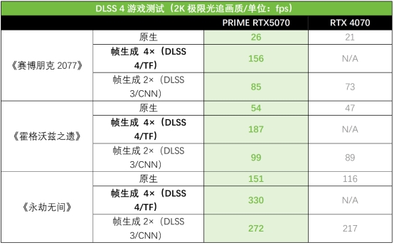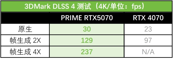 DLSS 4是RTX 50系列的重点技术,在全新Transformer模型加持下,DLSS 4不但能够提供更好的画质和效率,还能通过多帧生成技术巨幅提升游戏帧率,让4K游戏大作能够实现像电竞网游那样数百帧的超高流畅度!从测试成绩来看,PRIME RTX5070开启4×多帧生成,相对原生提升了690%,相对2×帧生成提升了84%,对比上代RTX 4070开启DLSS 3帧生成的话则提升了144%。显然,DLSS 4可以让PRIME RTX5070拥有更大的性能优势。