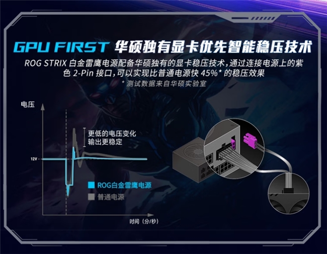 电源作为整机运行的基础保障,其稳定性与能效表现直接关系到系统长期使用体验。为此,小编为大家带来了爆款ROG白金雷鹰氮化镓电源。其提供850W、1000W及1200W多种功率版本,便于玩家根据自身硬件配置进行选择。并且搭载华硕显卡优先智能稳压技术,响应速度快,可在负载变化时为显卡提供更加稳定的电压支持,从而提升整机运行稳定性。氮化镓晶体管的引入,有助于降低开关损耗,在提升能效的同时,进一步优化电源体积与散热表现。