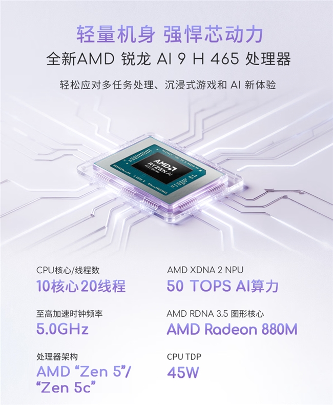 处理器方面,它搭载AMD锐龙AI 9 H 465处理器,采用AMD“Zen 5”/“Zen 5c”架构,10核心20线程设计,最高主频可达5.0GHz。搭配32GB LPDDR5X超高频内存,进一步优化系统及大型应用程序启动速度,多任务处理能力出色。同时,该处理器还集成AMD Radeon 880M核显,拥有12CU图形核心数,不仅支持视频AV1硬件编解码,还带来主流MOBA、FPS游戏沉浸体验;AMD XDNA 2 NPU,提供至高50 TOPS AI算力,加速本地AIGC创作效率。搭配华硕冰锋散热架构,采用内吹风道设计、双风扇、双热管,实现990g轻量化机身下至高45W强劲性能释放,并支持通过Fn+F快捷切换安静/标准/性能三种散热模式,轻松适配多种用机场景。