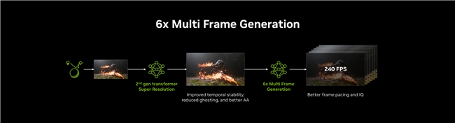 DLSS 4.5技术采用全新6倍多帧生成模式,实现了流畅度的巨大飞跃!凭借第二代 Transformer 模型的出色图像稳定性,结合帧率控制与画质的优化,DLSS 4.5技术可为每个渲染帧额外生成多达5帧,实现最高6倍的帧率提升!