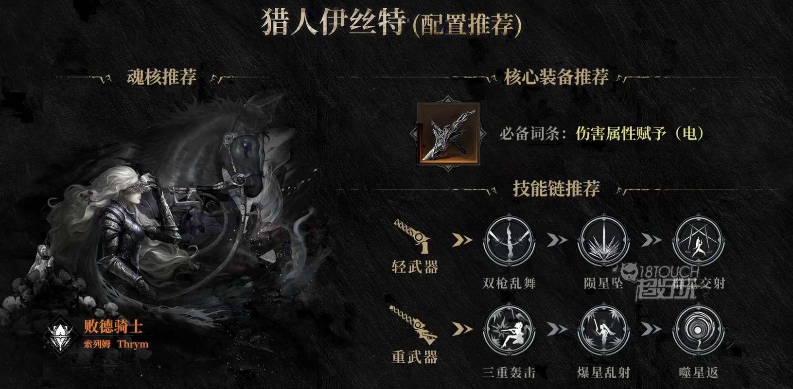 1、猎人伊斯特推荐魂核【败德骑士索列姆】,核心装备必备词条【伤害属性赋予(电)】