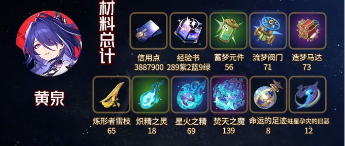 黄泉培养材料需要蓄梦元件、流梦阀门、炼形者雷枝等等,行于流逝的岸光锥培养材料需要造梦马达、焚天之魔等,加拉赫培养材料需要造梦马达、忿火之心等。