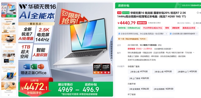 年末双十一大促向来是换机高峰期,对于大学生和初入职场的年轻人来说,一台能够兼顾学习、办公与娱乐的轻薄本早已成为高效生活的必备伙伴。在今年的4K档笔电中,华硕无畏16 2025凭借AMD锐龙7标压处理器、2.5K 144Hz高分高刷大屏以及至高40GB内存扩展,成为值得重点关注的选手。双十一购机部分地区可享至高10%政府补贴,到手价4472.1元(活动详情可咨询客服了解)。